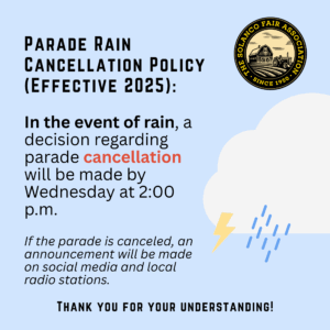 Rain Schedule – In the case of rain during fair week the below schedule will be followed. In case of rain Wednesday the Street Parade is rescheduled for Thursday night and the Baby Parade will be held Friday morning at 10 AM. Registration at 9 AM, prejudging at 9:15 AM. Or, if it rains Thursday night, the Baby Parade will be rescheduled for Friday morning. If the Baby Parade is rescheduled Friday, it will be held indoors in case of bad weather.